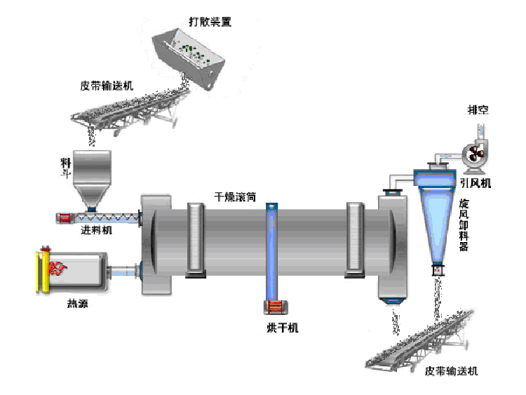 干燥的濕物料由皮帶輸送機或斗式提升機送到料斗,然后經料斗的加料機通過加料管道進入加料端。加料管道的斜度要大于物料的自然傾角,以便物料順利流入干燥器內。干燥器圓筒是一個與水平線略成傾斜的旋轉圓筒。物料從較高一端加入,載熱體由低端進入,與物料成逆流接觸,也有載熱體和物料一起并流進入筒體的。隨著圓筒的轉動物料受重力作用運行到較底的一端。濕物料在筒體內向前移動過程中,直接或間接得到了載熱體的給熱,使濕物料得以干燥,然后在出料端經皮帶機或螺旋輸送機送出。在筒體內壁上裝有抄板,它的作用是把物料抄起來又撒下,使物料與氣流的接觸表面增大,以提高干燥速率并促進物料前進。載熱體一般分為熱空氣、煙道氣等。載熱體經干燥器以后,一般需要旋風除塵器將氣體內所帶物料捕集下來。如需進一步減少尾氣含塵量,還應經過袋式除塵器或濕法除塵器后再放排放。